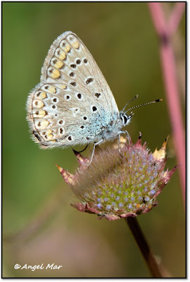 Uno de los azules más bonitos sin duda, popularmente "Dos puntos" en referencia a los que presenta en la zona basal de las alas anteriores. Vuela en toda la Península, excepto la franja sur. La fotografía inferior es de una hembra.
